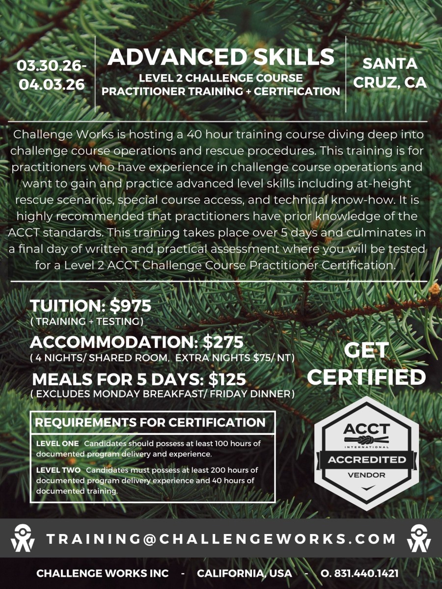 Challenge Works is hosting a 40 hour training course diving deep into challenge course operations and rescue procedures. This training is for practitioners who have experience in challenge course operations and want to gain and practice advanced level skills including at-height rescue scenarios, special course access, and technical know-how. It is highly recommended that practitioners have prior knowledge of the ACCT standards. This training takes place over 5 days and culminates in a final day of written and practical assessment where you will be tested for a Level 2 ACCT Challenge Course Practitioner Certification.
